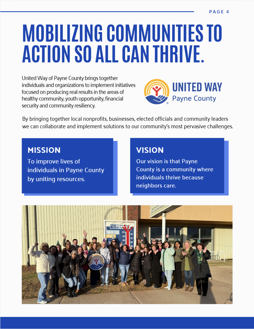 United Way of Payne County works hard to maintain the utmost integrity in transparency, accountability and accuracy in our financial records and reporting. The Annual Report shares information about our financial performance, the impact of donor contributions and initiatives of our partner agencies.