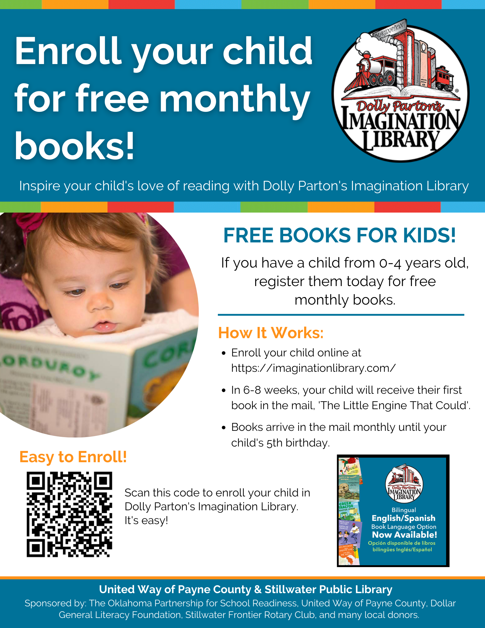 Help us boost early childhood literacy in Payne County! Visit the links below to learn more about the program, sign up a child, or donate to fund their books.