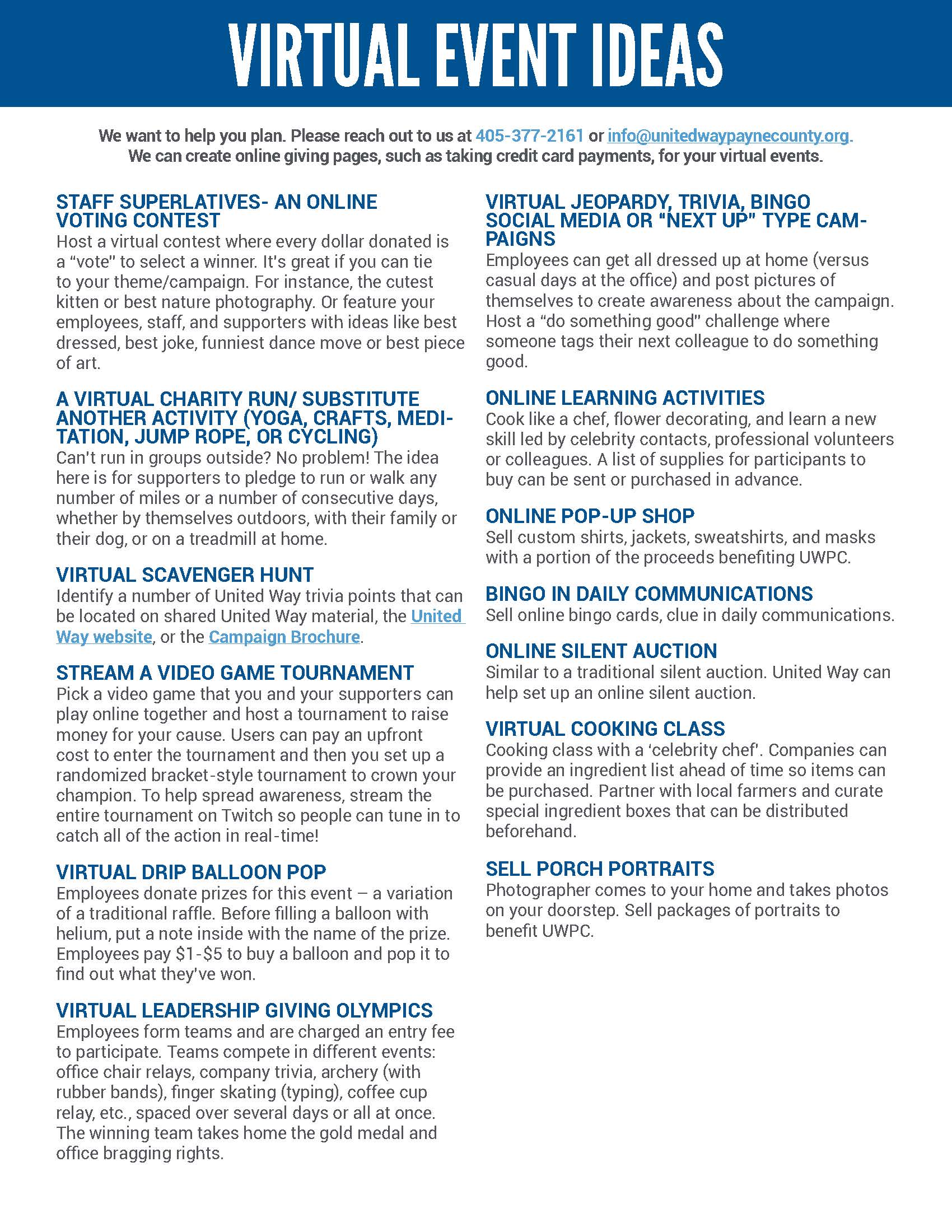 Please reach out to us at 405-377-2161 or info@unitedwaypaynecounty.org for assistance with online webform pages, credit card payments, raffles, silent auctions, and more.